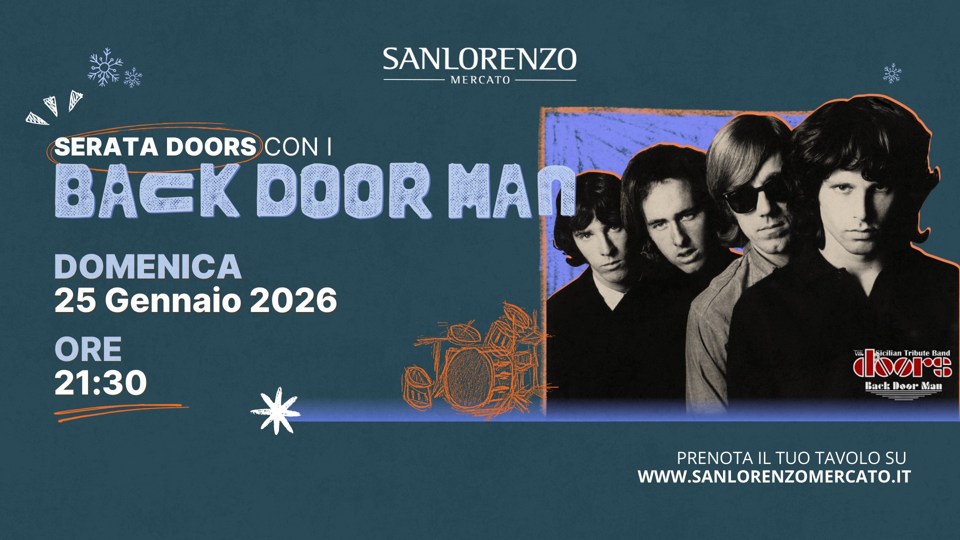Domenica 25 Gennaio alle 21:30, Sanlorenzo Mercato si trasforma in un club della Los Angeles anni ’60. Sul palco arrivano i Back Door Man, la tribute band che riporta in vita il mito sciamanico di Jim Morrison e il sound ipnotico dei The Doors.