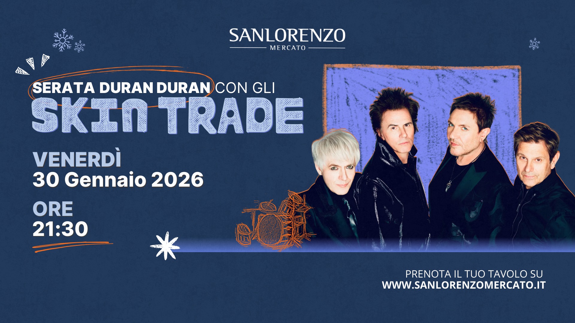 Venerdì 30 Gennaio alle 22:00, Sanlorenzo Mercato fa un salto nel tempo! Sul palco arrivano gli Skin Trade, la tribute band dedicata ai leggendari Duran Duran, per una serata all’insegna del pop-rock più iconico di sempre.